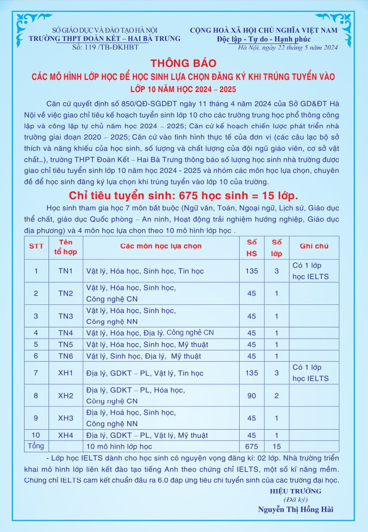 Các mô hình lớp học để học sinh lựa chọn đăng kí khi trúng tuyển vào lớp 10, năm học 2024-2025.