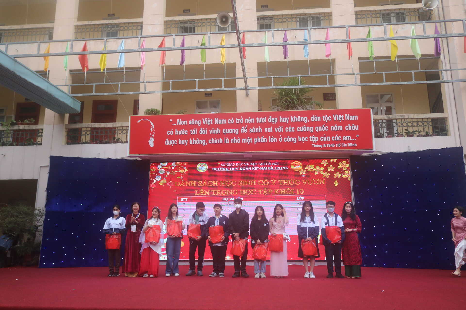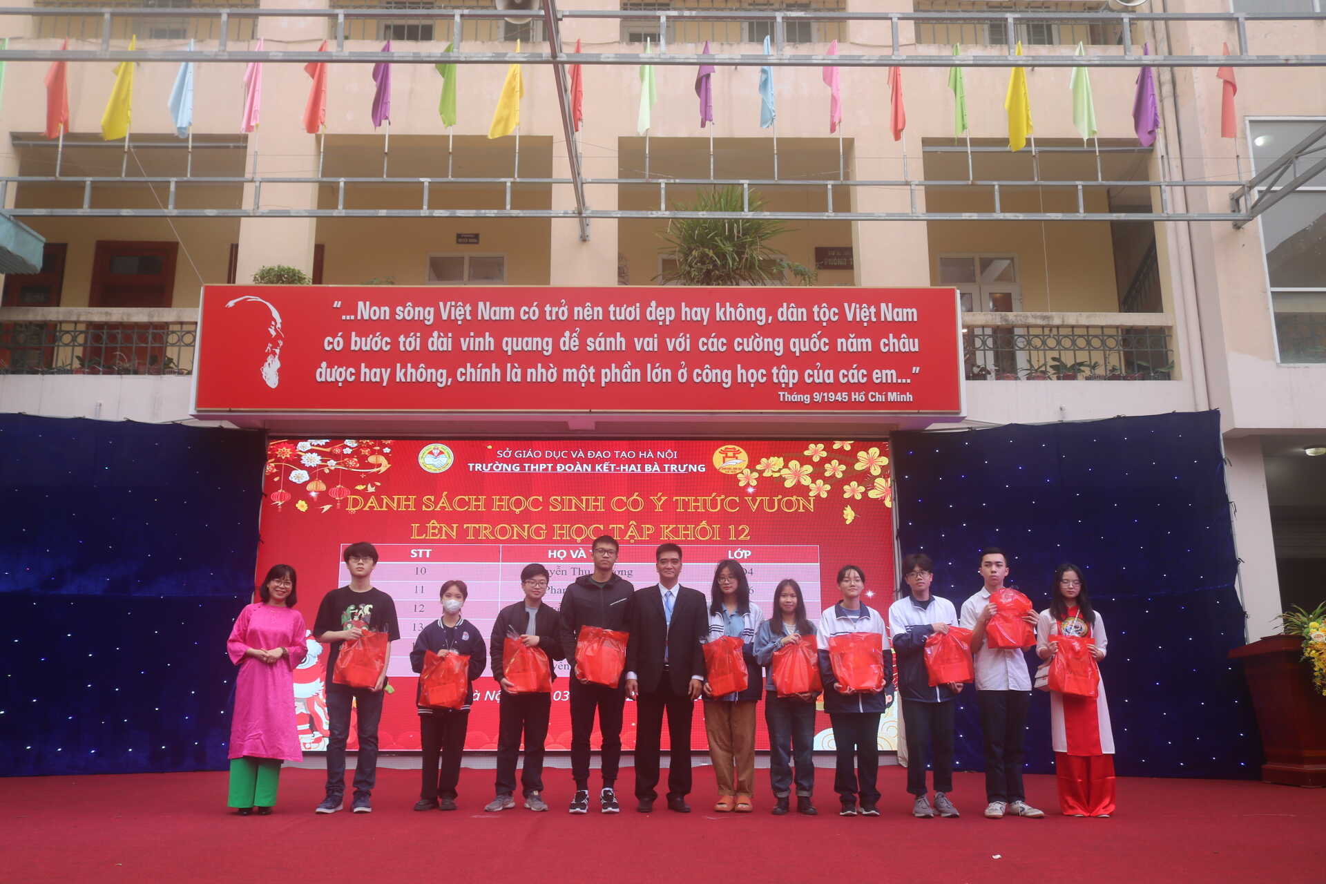 Tiếp đến là phần trao quà cho các học sinh có ý thức vươn lên trong học tập của cả ba khối 10,11,12.