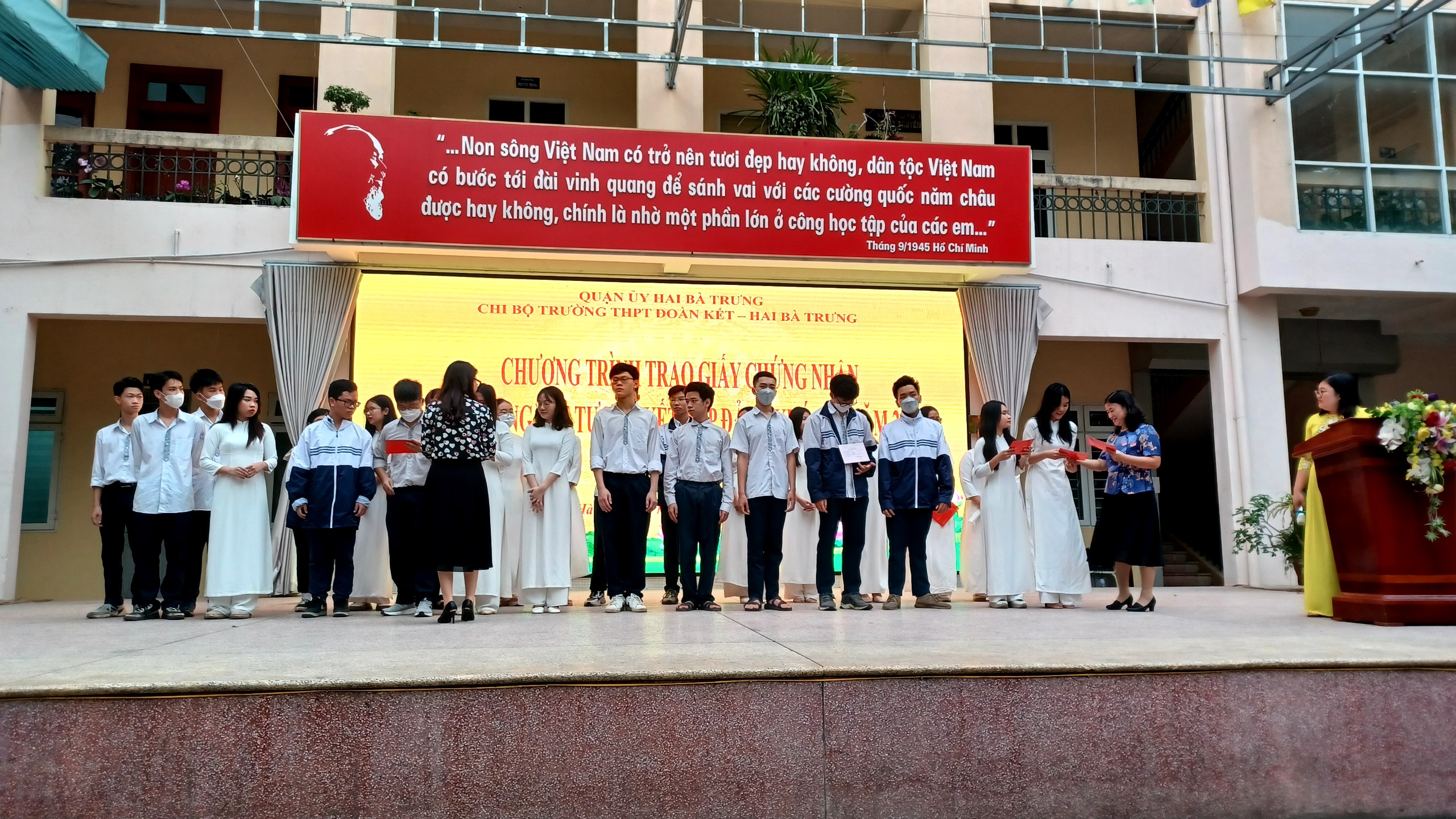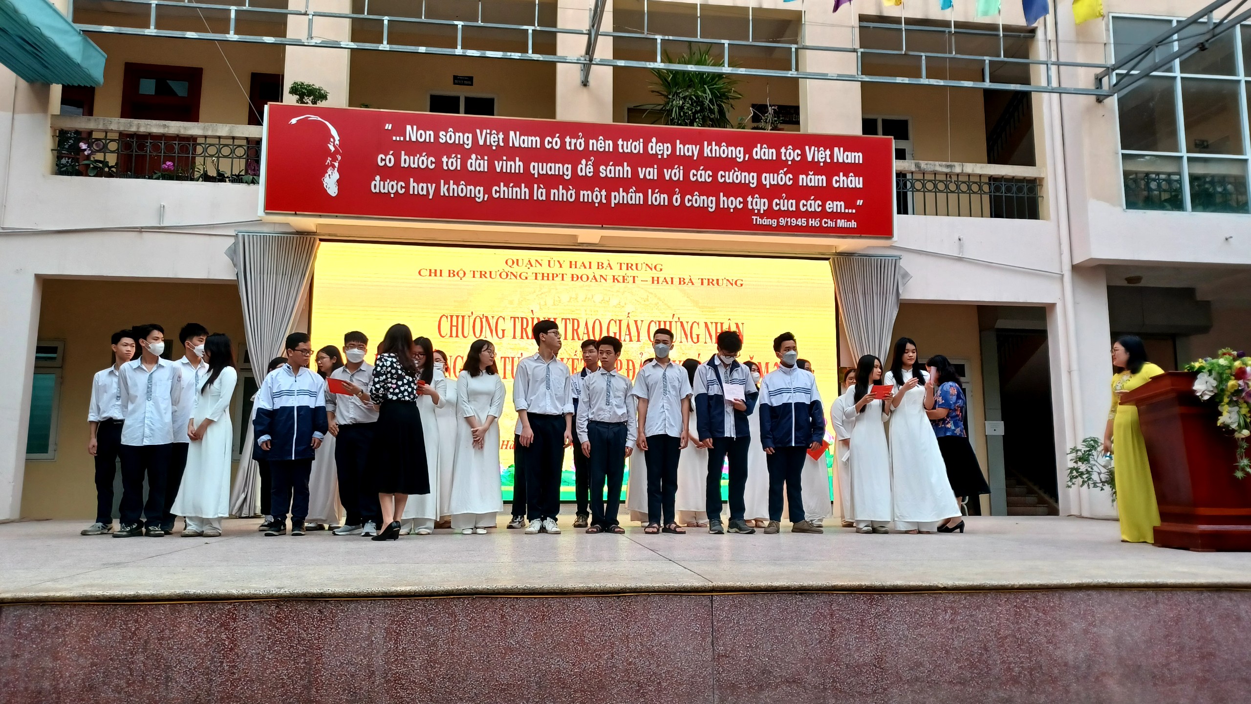 Chiều ngày 17/04/2023, trong buổi sinh hoạt dưới cờ của khối chiều trường THPT Đoàn Kết-Hai Bà Trưng đã diễn ra chương trình trao giấy chứng nhận bồi dưỡng đối tượng kết nạp Đảng khóa III năm 2023. Tham dự chương trình có đồng chí Ngô Kim Anh - Phó GĐ Trung tâm chính trị Quận Hai Bà Trưng và đồng chí Đinh Thị Thu Trang - phó trưởng ban tổ chức Quận uỷ Hai Bà Trưng cùng các đồng chí trong ban tổ chức Quận uỷ, trung tâm CT quận HBT.