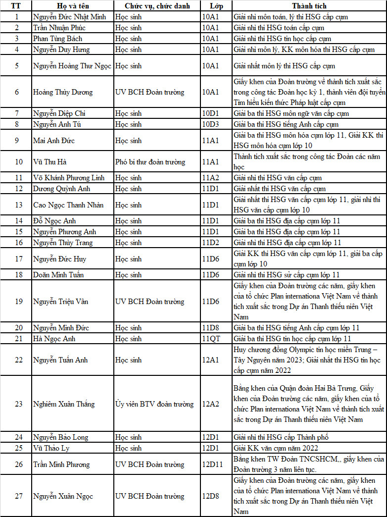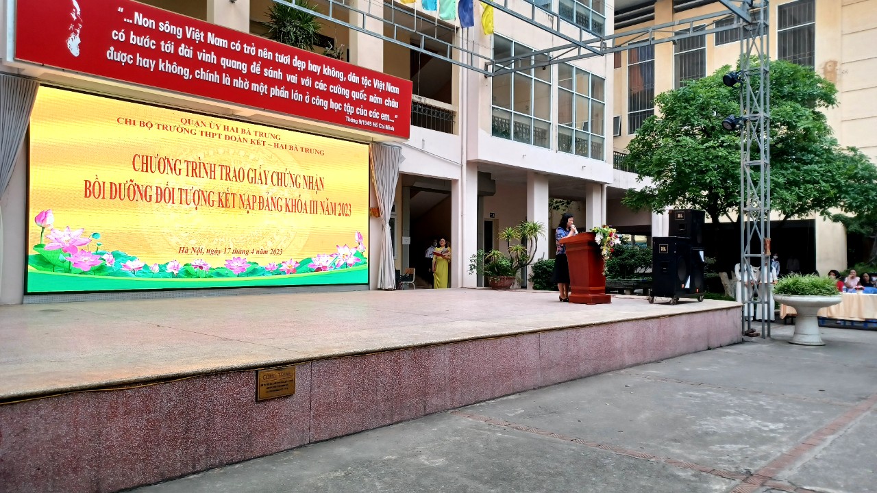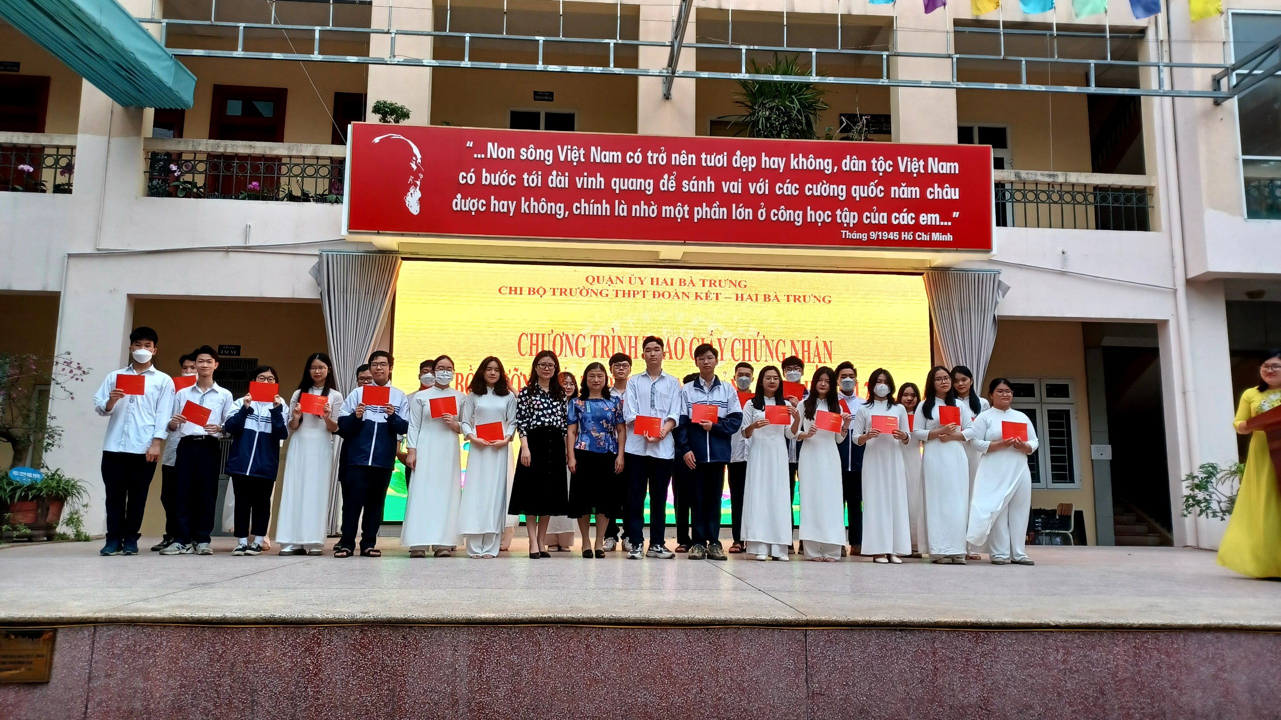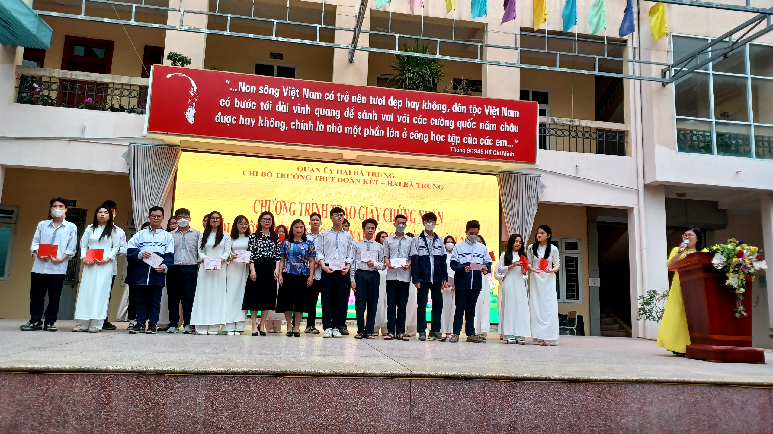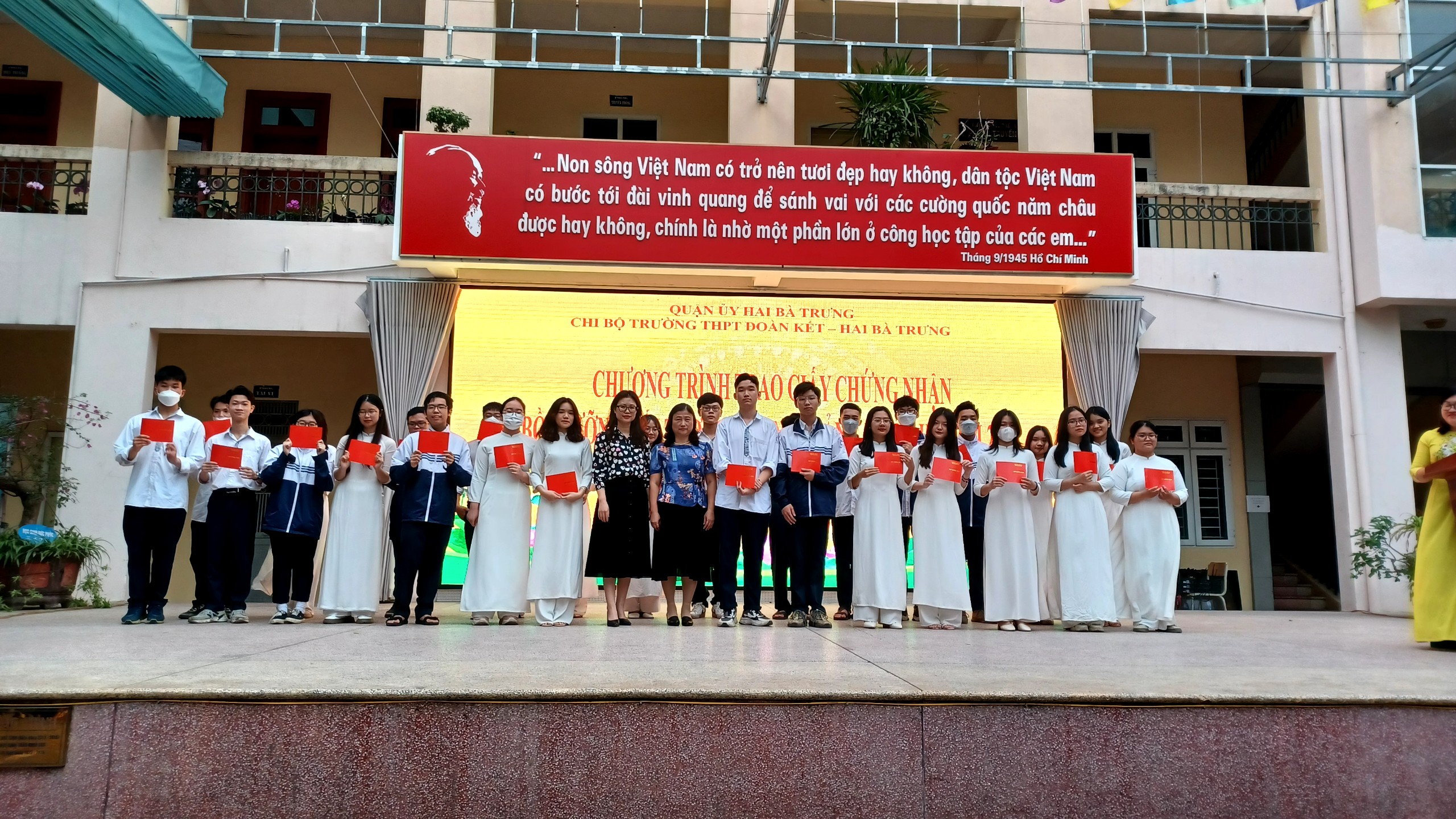 Nhận thức được kết nạp đảng viên là học sinh trung học phổ thông không chỉ góp phần trẻ hóa đội ngũ đảng viên của Đảng, mà quan trọng hơn là góp phần định hướng công tác giáo dục chính trị, tư tưởng trong các nhà trường, lan tỏa niềm tin yêu của thế hệ trẻ đối với Đảng Cộng sản Việt Nam quang vinh, sớm tạo nguồn cán bộ lâu dài cho quê hương, đất nước. Thực hiện Chỉ thị số 12-CT/TU ngày 09/10/2012 của Thành ủy về “đẩy mạnh công tác phát triển đảng viên trong đội ngũ trí thức và học sinh, sinh viên thuộc Đảng bộ Thành phố” và Hướng dẫn số 11- HD/BTCTU, ngày 21/11/2022 của Ban Tổ chức Thành ủy Hà Nội về việc quy trình tạo nguồn kết nạp đảng viên mới là học sinh đang học THPT trên địa bàn thành phố, Chi bộ trường THPT Đoàn Kết-Hai Bà Trưng luôn quan tâm tăng cường công tác giáo dục chính trị, tư tưởng trong đoàn viên, thanh niên, gắn với phát hiện, bồi dưỡng và kết nạp những học sinh đủ tiêu chuẩn vào Đảng, góp phần củng cố, xây dựng, nâng cao chất lượng tổ chức đảng, đoàn thể và chất lượng đảng viên. Nhà trường cũng có kế hoạch tăng cường giáo dục chính trị cho học sinh, thông qua công tác phát triển Đảng, kết nạp đảng viên trong học sinh, khơi dậy khát vọng cống hiến trong thế hệ trẻ. Năm học 2022-2023, Chi bộ trường THPT Đoàn Kết-Hai Bà Trưng đã chọn cử 27 học sinh là quần chúng có thành tích trong lao động, học tập, tích cực tham gia các phòng trào hoạt động của nhà trường tham gia lớp Bồi dưỡng nhận thức về Đảng do Quận ủy HBT tổ chức