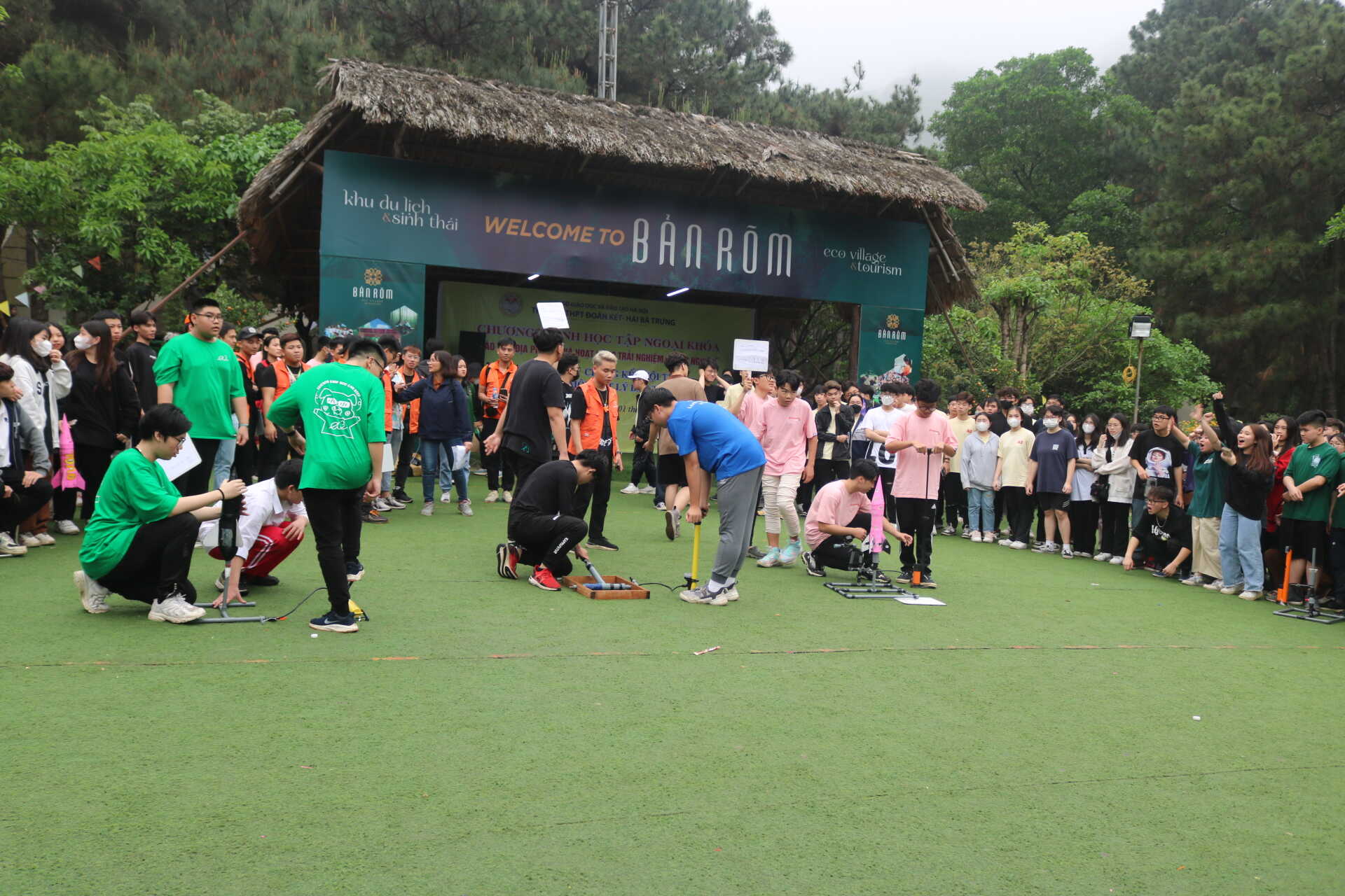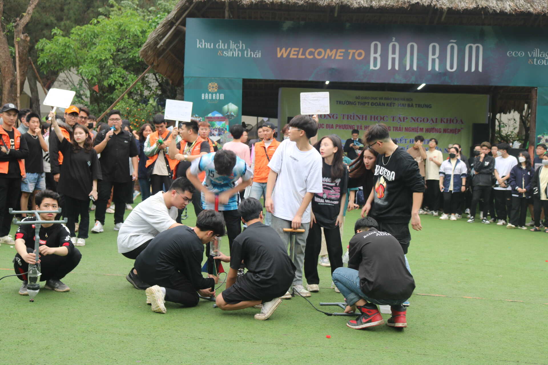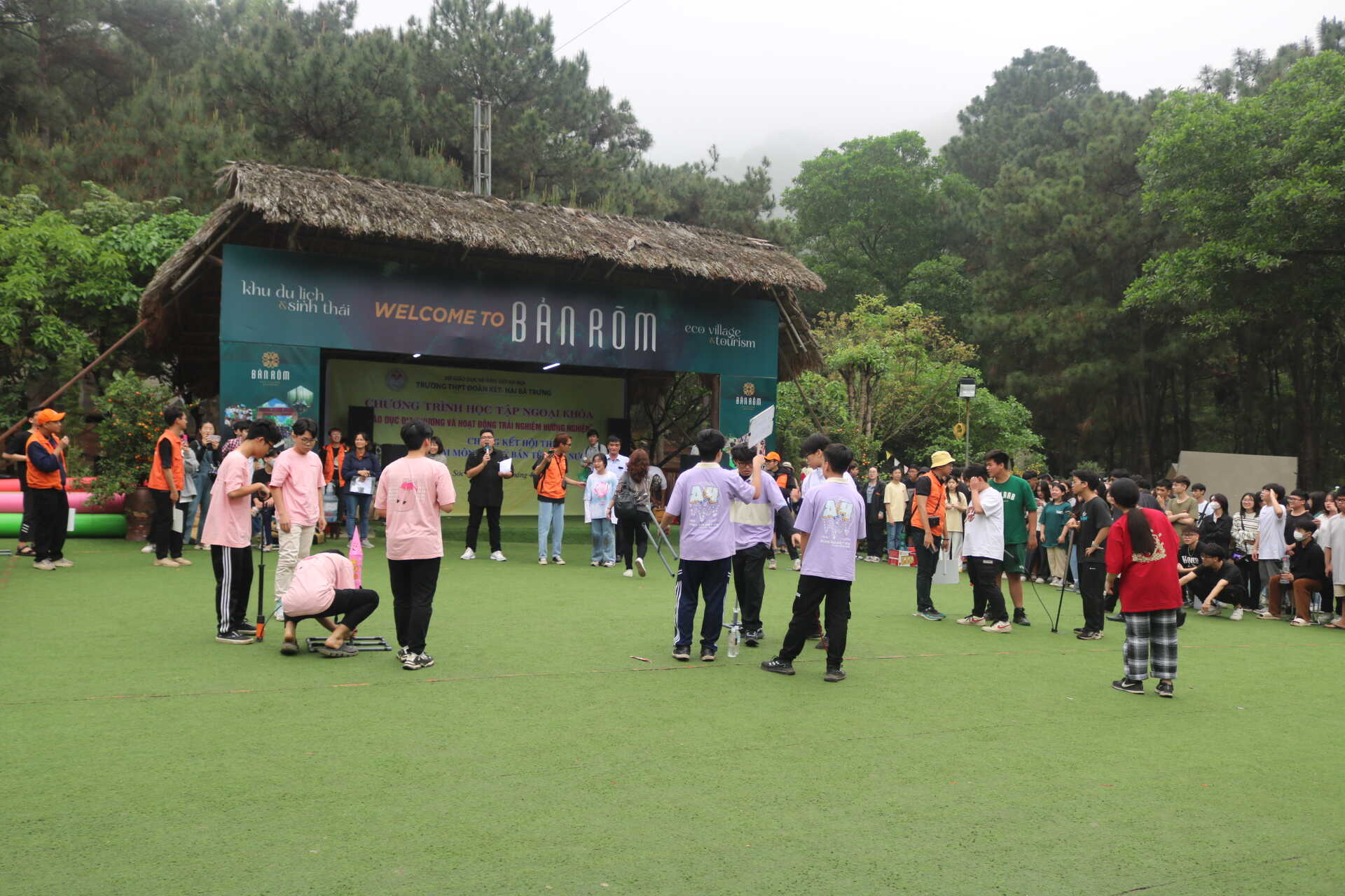 Kết thúc thăm quan khu di tích Đền Sóc các em học sinh di chuyển sang khu du lịch Bản Rõm. Tại đây, học sinh sẽ tham gia 02 hoạt động chủ đạo đó là: Trải nghiệm sinh tồn và TeamBuilding. Khi tham gia hoạt động “Trải nghiệm sinh tồn”, học sinh sẽ phải vượt qua thử thách tại các trạm trải nghiệm: