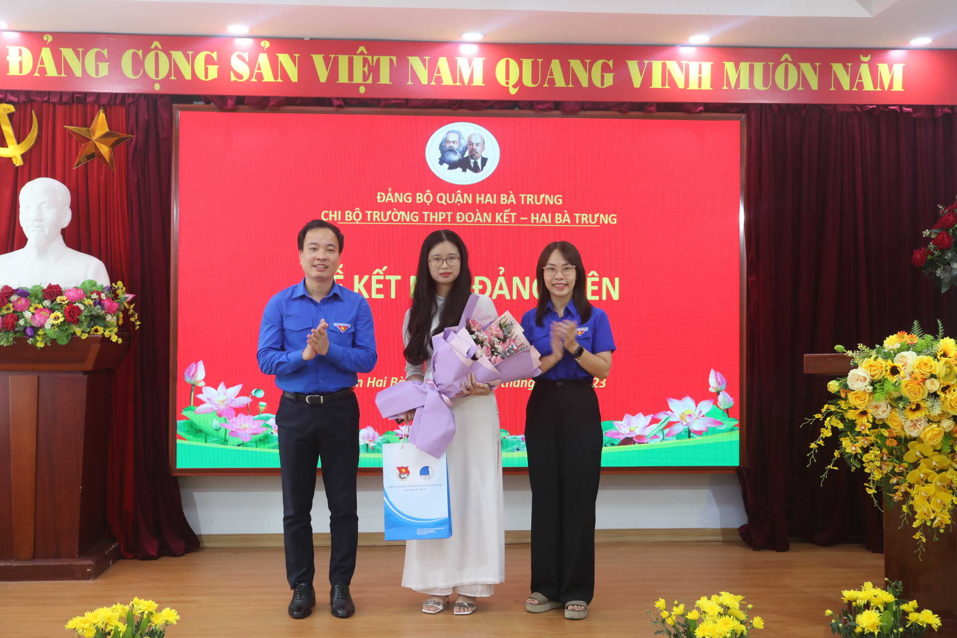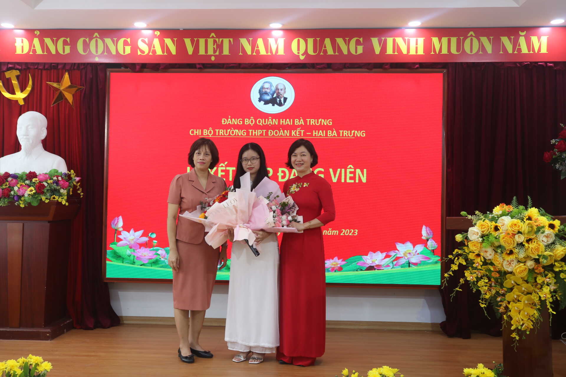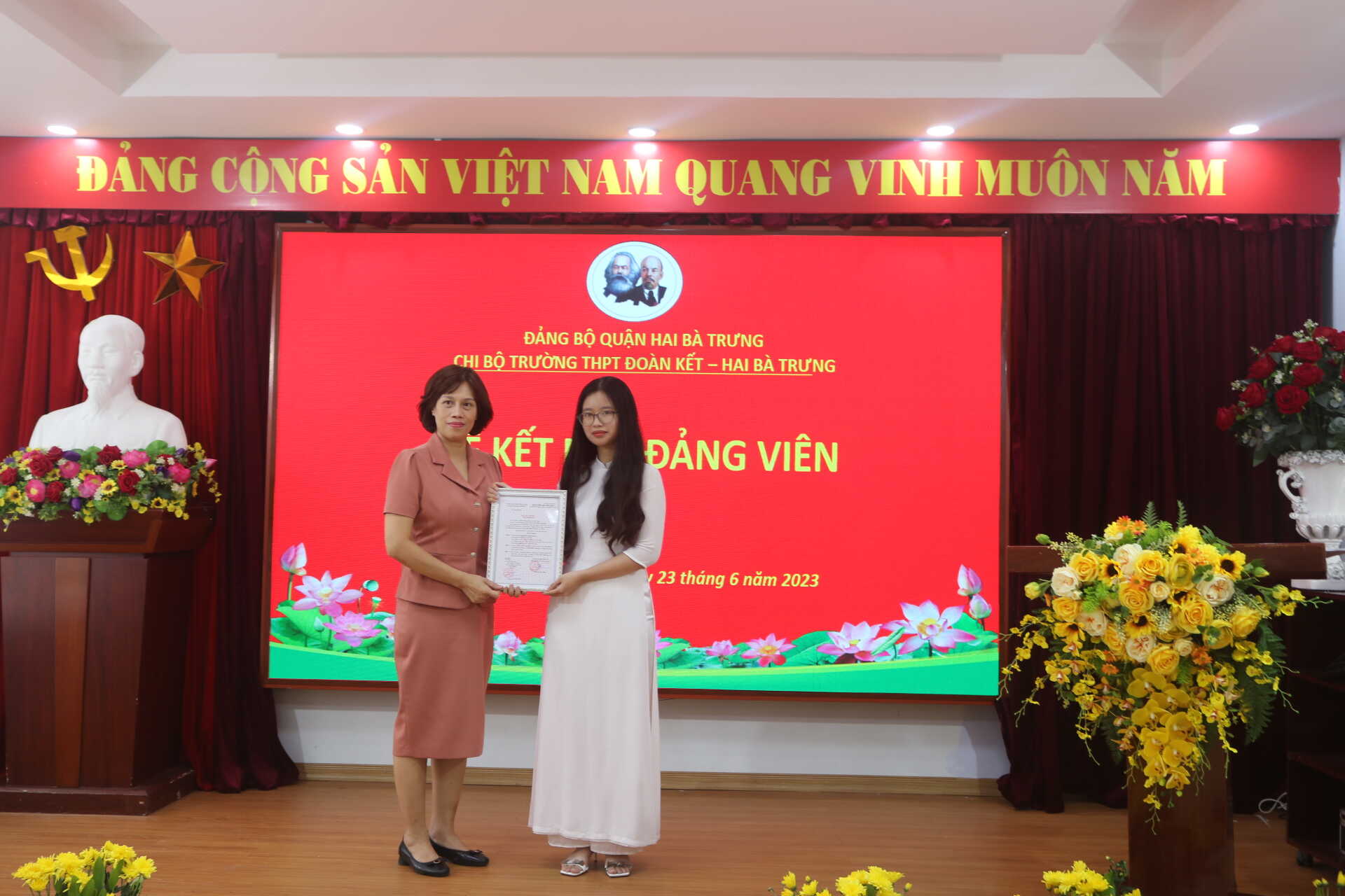 Tại buổi lễ, lãnh đạo quận Hai Bà Trưng đã trao Quyết định kết nạp Đảng và tặng hoa chúc mừng em Trần Minh Phương, học sinh có thành tích xuất sắc trong quá trình học tập, rèn luyện và được sự quan tâm, giáo dục, giúp đỡ của các đảng viên trong Chi bộ Trường THPT Đoàn Kết - Hai Bà Trưng.