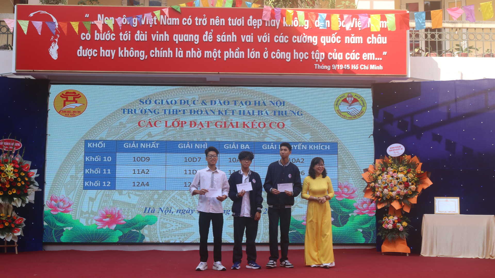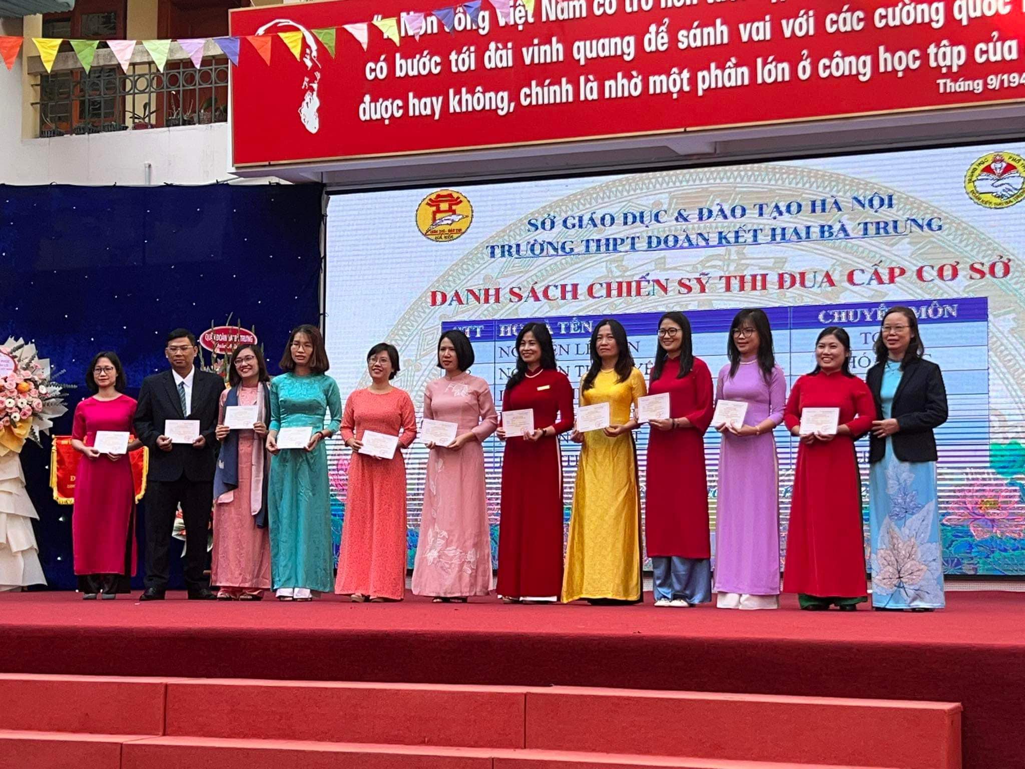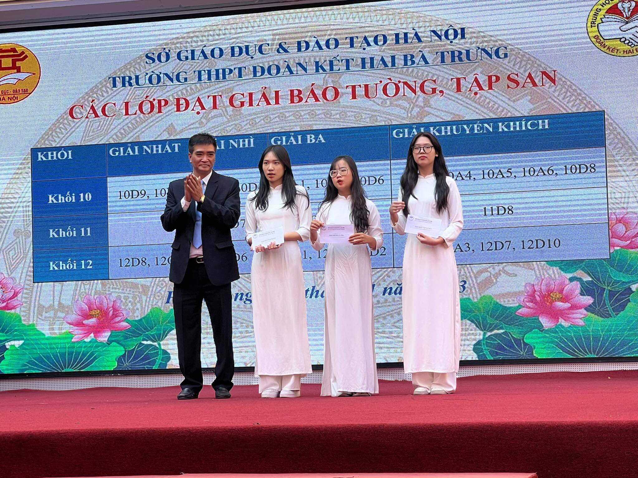 Buổi lễ được tiếp tục với chương trình tuyên dương khen thưởng. Về thành tích tập thể, trong năm học 2022-2023, nhà trường đã được UBND thành phố Hà Nội trao tặng Bằng khen theo quyết định số 4843/QĐ-UBND, do Chủ tịch UBND thành phố Trần Sỹ Thanh kí ngày 28/09/2023. Đoàn trường THPT Đoàn Kết-Hai Bà Trưng vinh dự được thành đoàn HN trao tặng cờ thi đua đơn vị dẫn đầu.