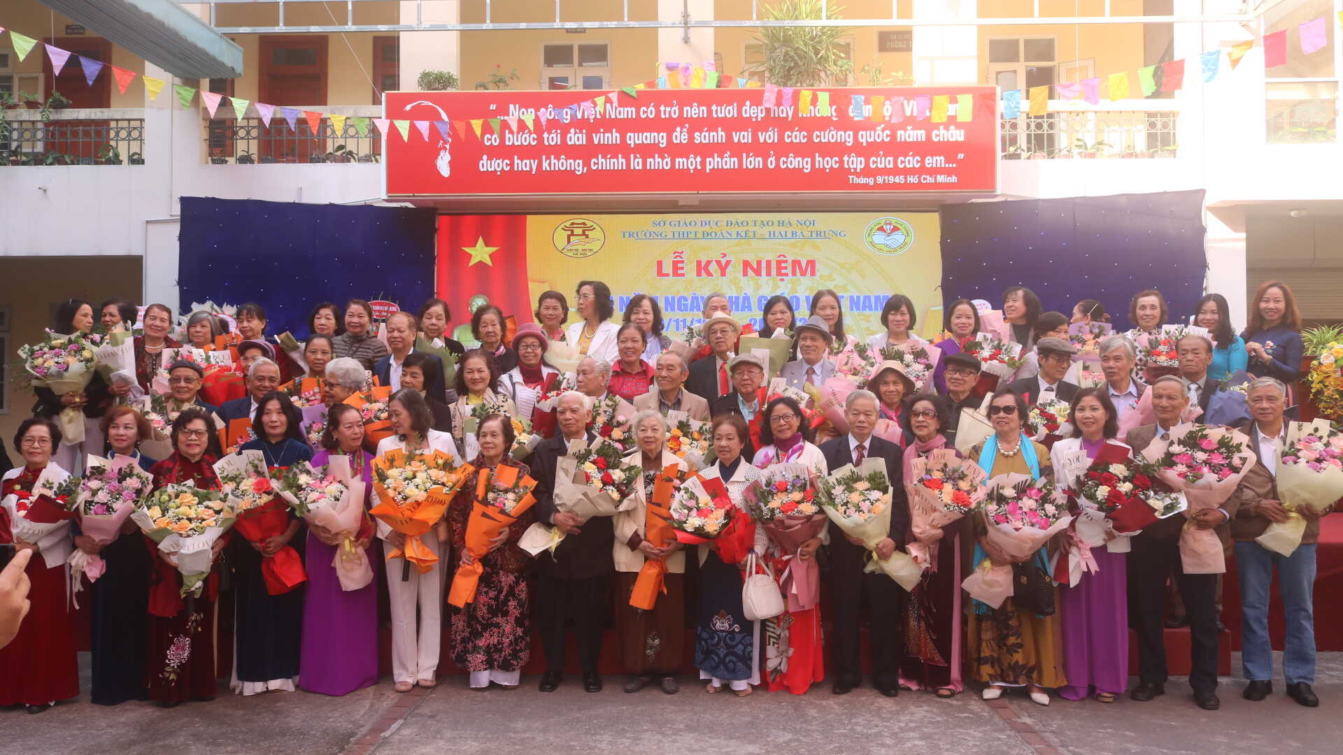 Hình ảnh các thầy cô, nguyên Ban giám hiệu nhà trường qua các thời kì, các thầy cô giáo, cán bộ nhân viên hội cựu giáo chức trường THPT Đoàn Kết-Hai Bà Trưng nhận những bó hoa tươi thắm, thay cho lời tri ân, lời chúc tốt đẹp nhất từ các thế hệ HS của nhà trường.