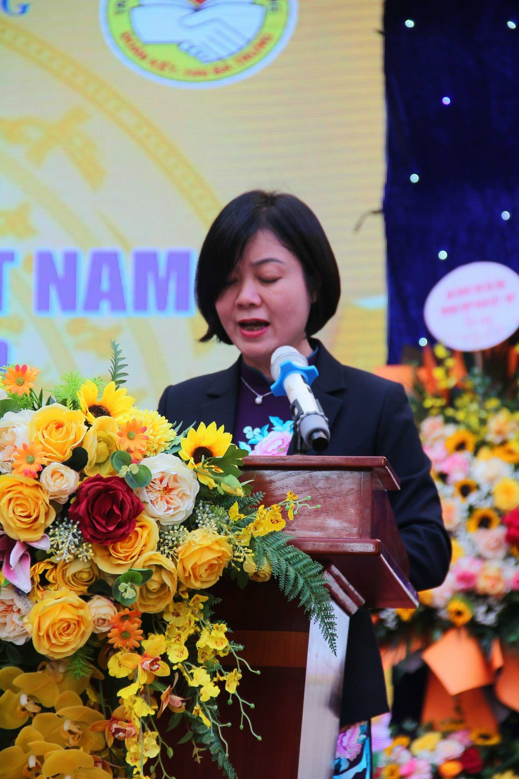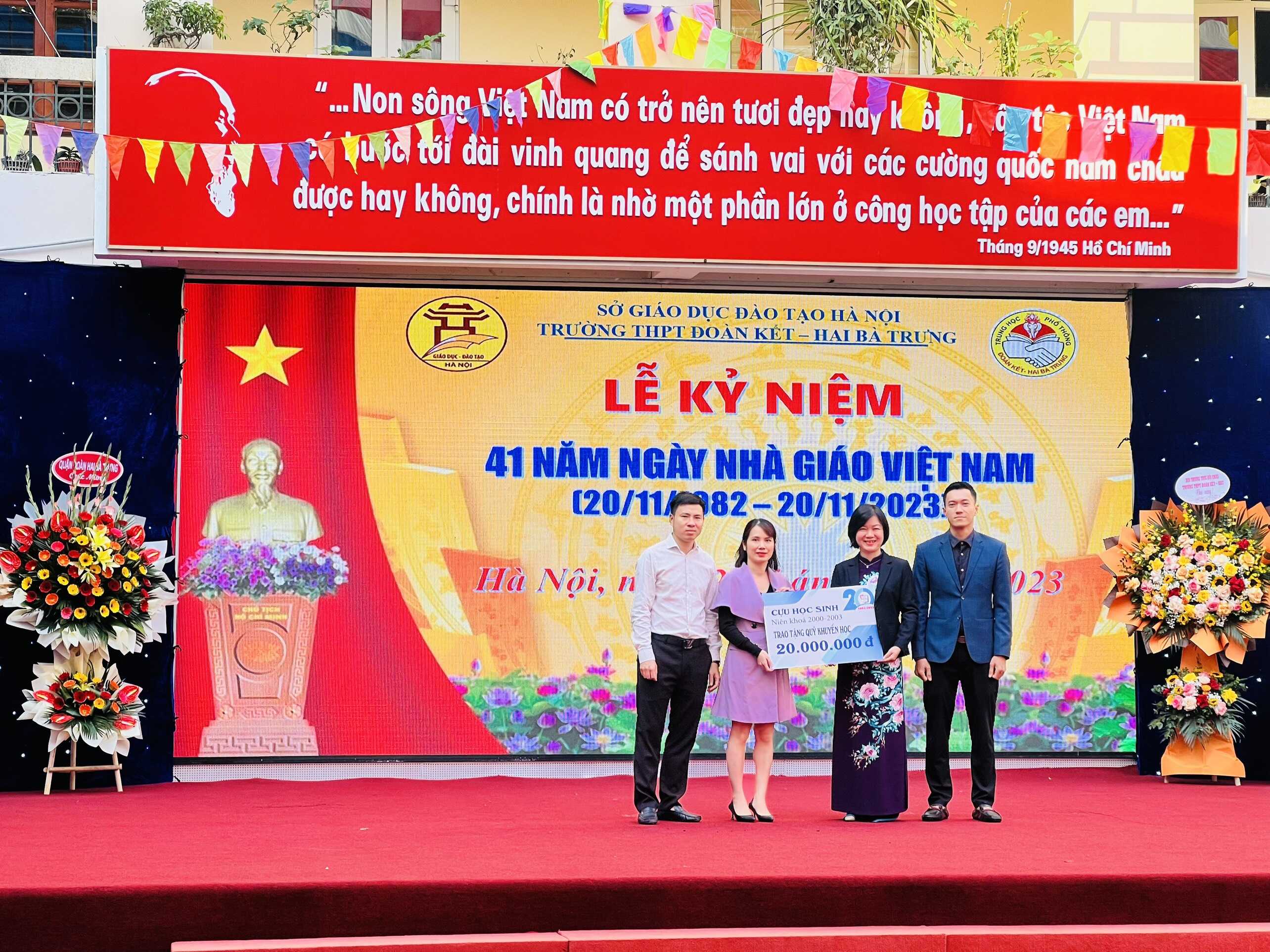 Tham gia lễ kỷ niệm 41 năm ngày nhà giáo Việt Nam, bà Doãn Thu Hiền phát biểu tri ân các thầy cô giáo và đại diện ban liên lạc cựu học sinh khóa 2000-2023 đã tặng cho quỹ khuyến học trường THPT Đoàn Kết-Hai Bà Trưng số tiền 20.000.000đ.