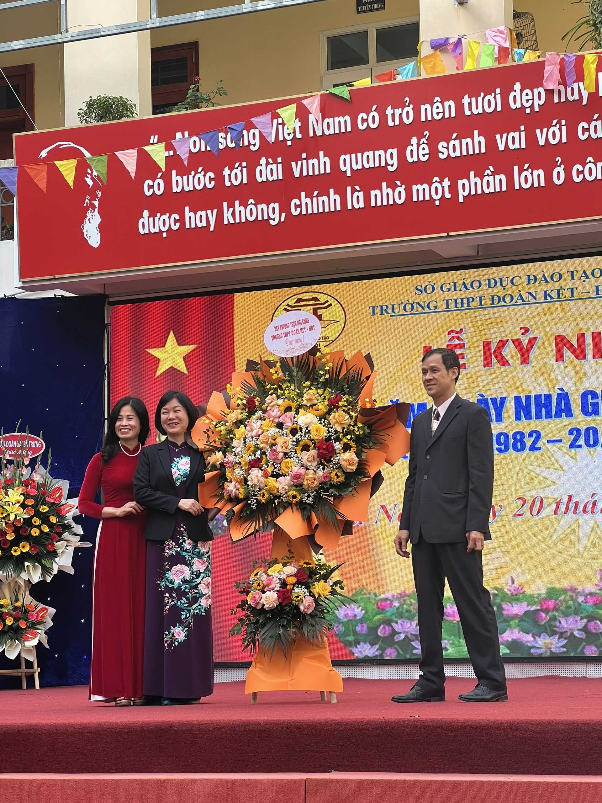 Hòa chung với không khí tưng bừng, phấn khởi của ngành giáo dục cả nước kỉ niệm 41 năm ngày Nhà giáo Việt Nam 20/11/1982 - 20/11/2023, thực hiện kế hoạch năm học và được sự đồng ý của Sở giáo dục và đào tạo, sáng ngày 20/11/2023 trường THPT Đoàn Kết - Hai Bà Trưng long trọng tổ chức Lễ kỉ niệm 41 năm ngày nhà giáo Việt Nam. Về dự buổi lễ có đồng chí Hà Lam Sơn- Chuyên viên sở giáo dục và đào tạo HN, đồng chí Nguyễn Quang Anh - phó chủ tịch phường Quỳnh Lôi, đồng chí Vũ Trường Giang - phó trưởng công an phường Quỳnh Lôi, bác Cao Anh Hòa - trưởng ban đại diện cha mẹ học sinh trường và các ông bà trong ban đại diện hội cha mẹ học sinh các lớp. Về phía nhà trường, có các thầy cô nguyên là Ban giám hiệu qua các thời kì, các thế hệ thầy giáo, cô giáo, cán bộ nhân viên nhà trường, Ban giám hiệu và cùng hơn 1000 hs đại diện cho học sinh toàn trường.