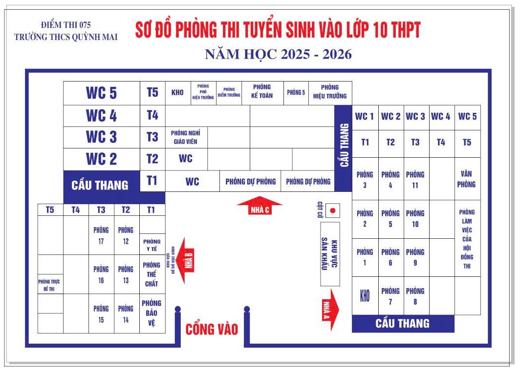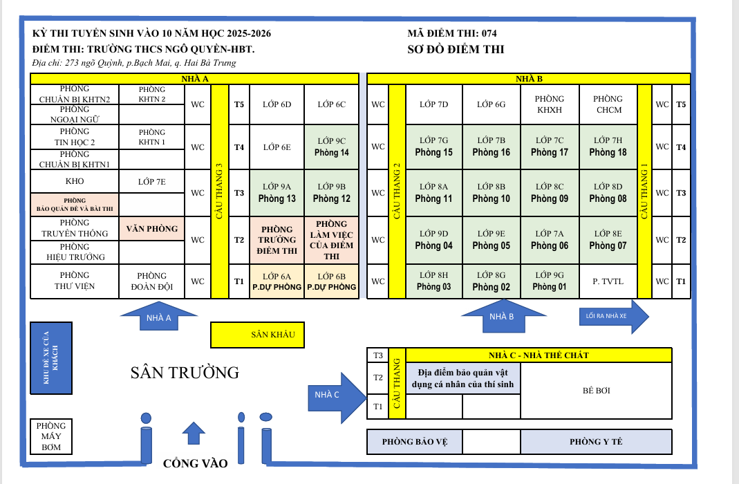 Kỳ thi tuyển sinh vào lớp 10 THPT năm học 2025-2026, các học sinh thi vào trường THPT Đoàn Kết - Hai Bà Trưng sẽ dự thi tại hai điểm thi: trường THCS Ngô Quyền và trường THCS Quỳnh Mai. Thí sinh cần xem kĩ phiếu báo dự thi để đến đúng địa điểm thi. Trường THPT Đoàn Kết - Hai Bà Trưng gửi tới các em sơ đồ phòng thi của hai địa điểm, lịch thi và các lưu ý trong quá trình thi. Hãy giữ tinh thần thật thoải mái, chuẩn bị đầy đủ giấy tờ và vật dụng cần thiết, đến điểm thi đúng giờ, bình tĩnh đọc kỹ đề, phân bố thời gian hợp lý và tự tin làm bài.