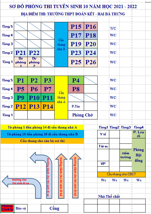 Trong kì thi tuyển sinh vào 10 năm học 2021-2022, có 1070 thí sinh dự thi vào trường THPT Đoàn Kết-Hai Bà Trưng được chia thành 47 phòng thi tại hai địa điểm: 26 phòng thi tại trường THPT Đoàn Kết- Hai Bà Trưng, địa chỉ 174 phố Hồng Mai, phường Quỳnh Lôi và 21 phòng thi tại trường THCS Hà Huy Tập tại số 19 ngõ 204 phố Hồng Mai, phường Quỳnh Lôi. Các em học sinh vào phòng thi theo sơ đồ sau: