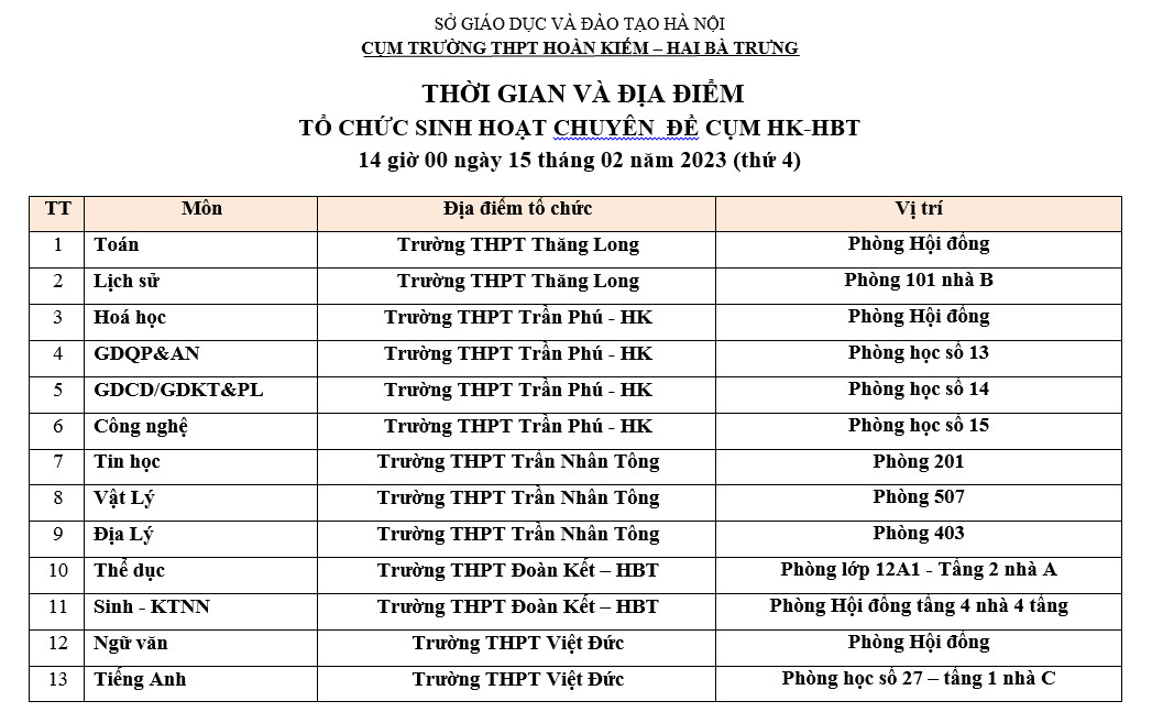 Chiều thứ Tư ngày 15/02/2023, cụm các trường THPT Hoàn Kiếm-Hai Bà Trưng đã tổ chức sinh hoạt chuyên đề cụm. Đây là một hoạt đồng thường niên của cụm nhằm nâng cao chất lượng dạy và học trong nhà trường. Buổi sinh hoạt được các trường phối hợp tổ chức với sự tham gia của các giáo viên trong cụm