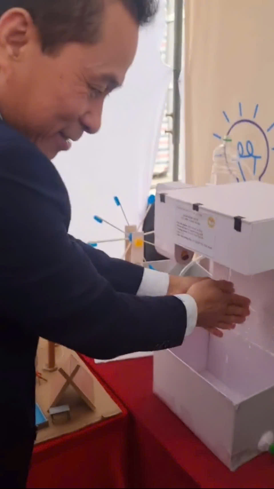 Thầy Hiệu trưởng Lê Việt Dương trải nghiệm máy rửa tay tự động