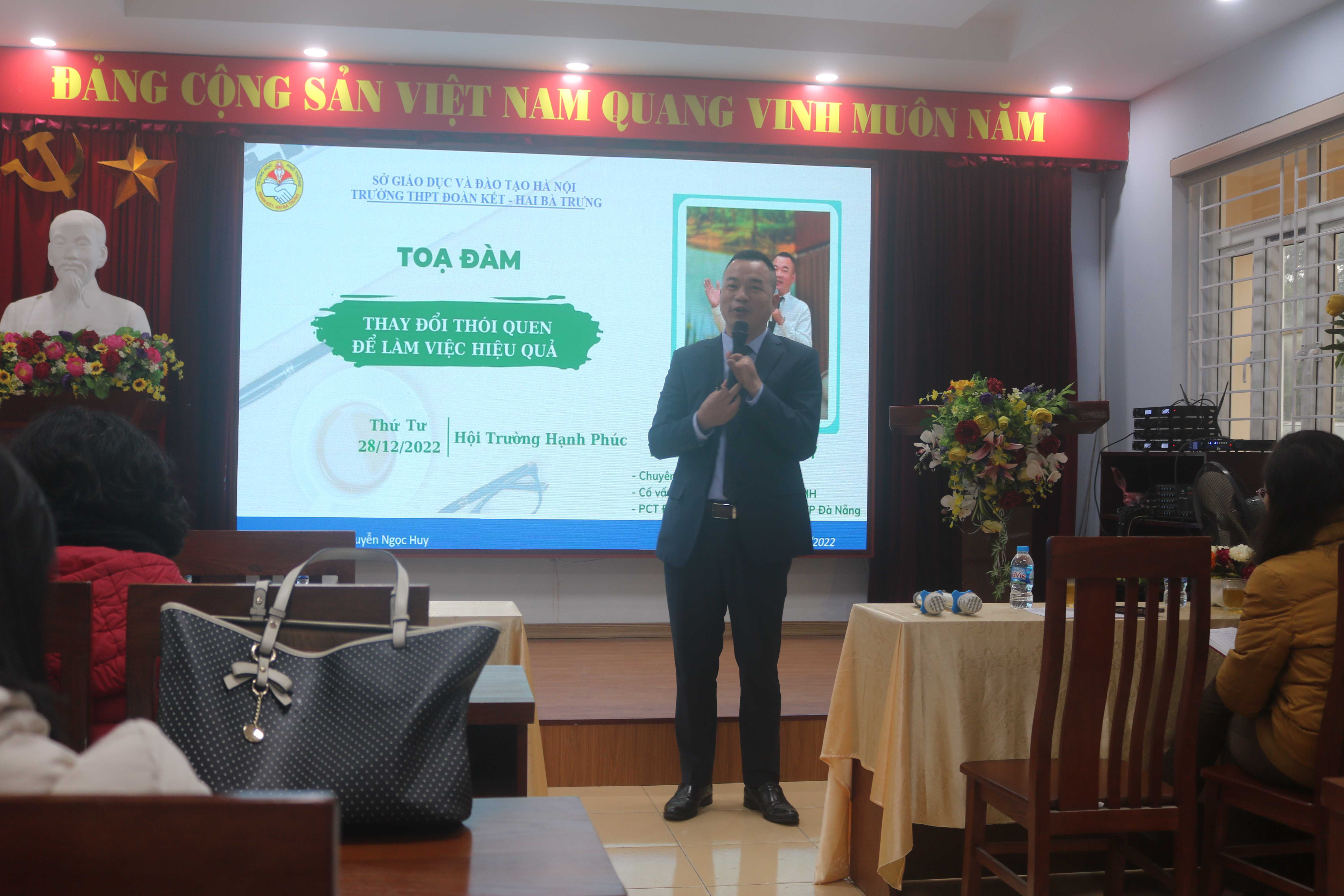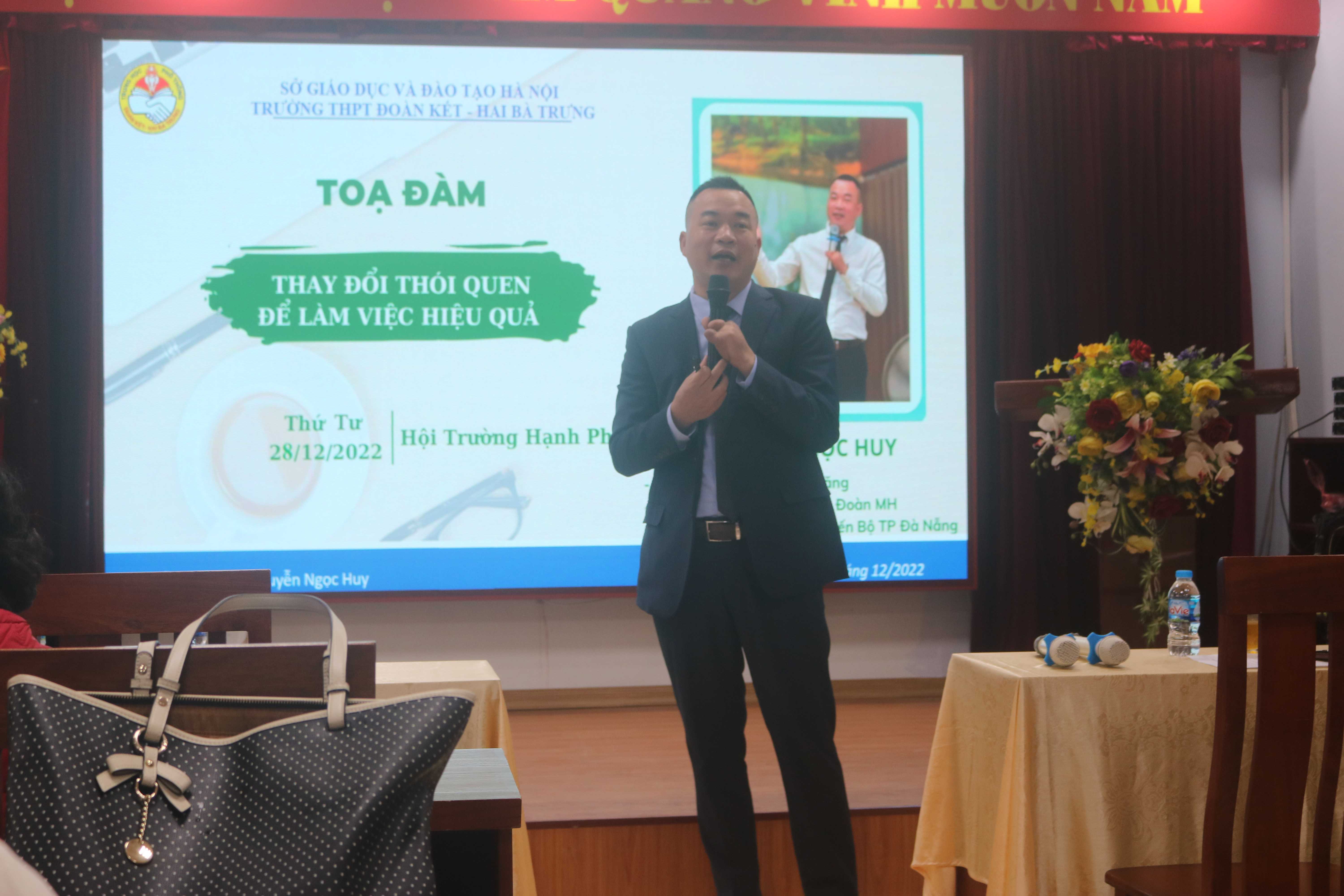 Buổi tọa đàm có TS NGUYỄN NGỌC HUY, Chuyên gia đào tạo kỹ năng, Cố vấn cao cấp HĐQT tập đoàn MH, PCT điều hành quỹ Vì sự tiến bộ thành phố Đà Nẵng, các thầy cô BGH, cùng toàn thể các thầy cô giáo trong hội đồng sư phạm nhà trường THPT Đoàn Kết-Hai Bà Trưng.