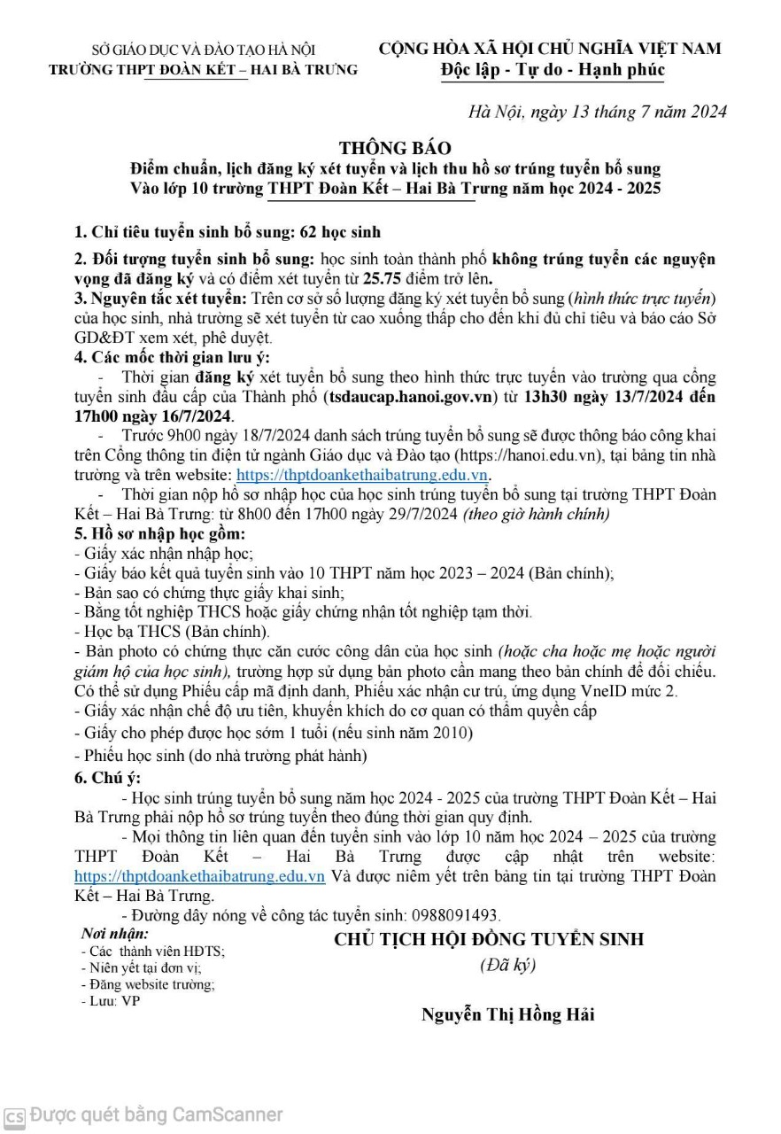 - Trước 9h00 ngày 18/7/2024 danh sách trúng tuyển bổ sung sẽ được thông báo công khai trên Cổng thông tin điện tử ngành Giáo dục và Đào tạo (https://hanoi.edu.vn), tại bảng tin nhà trường và trên website: https://thptdoankethaibatrung.edu.vn.