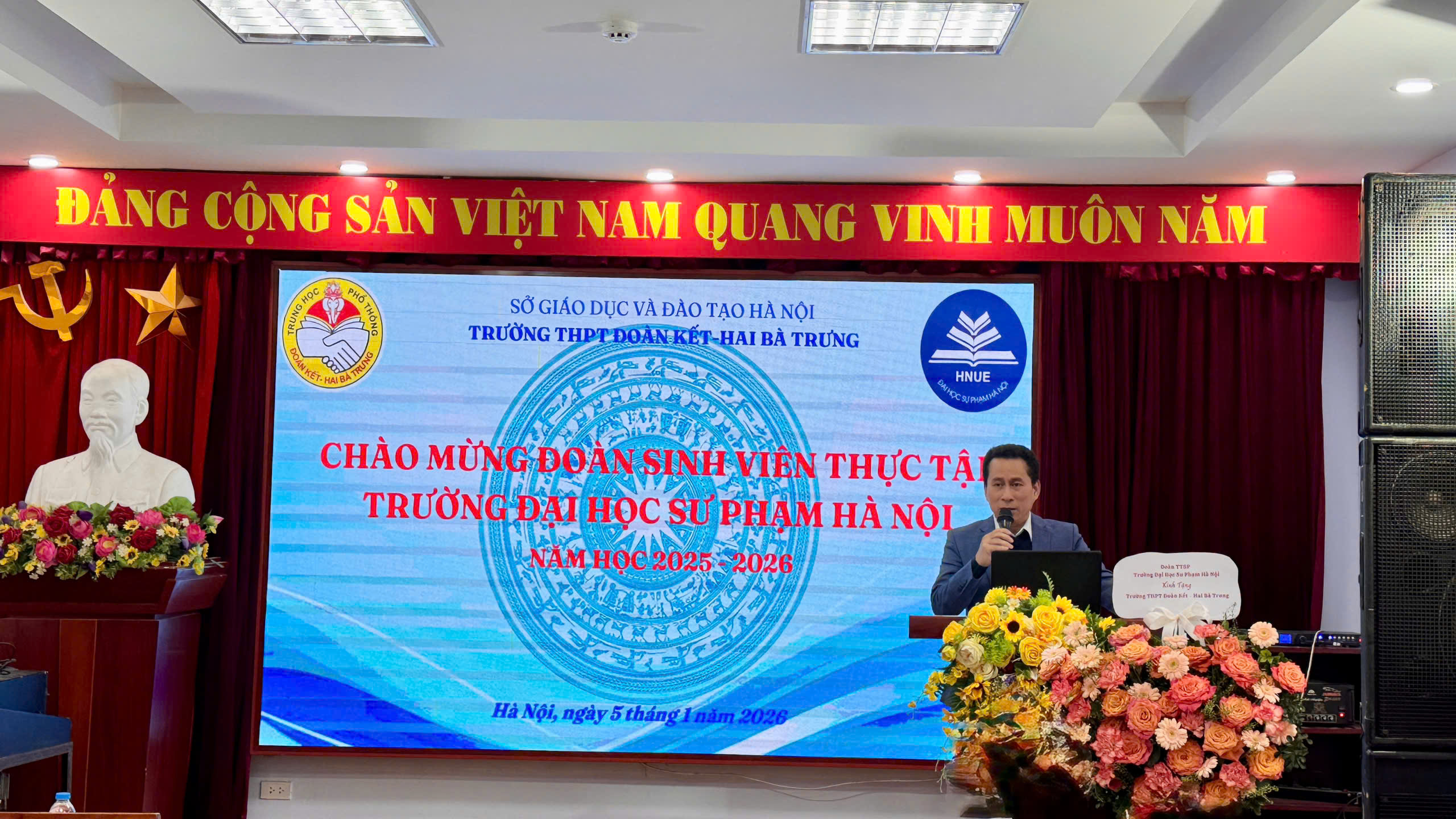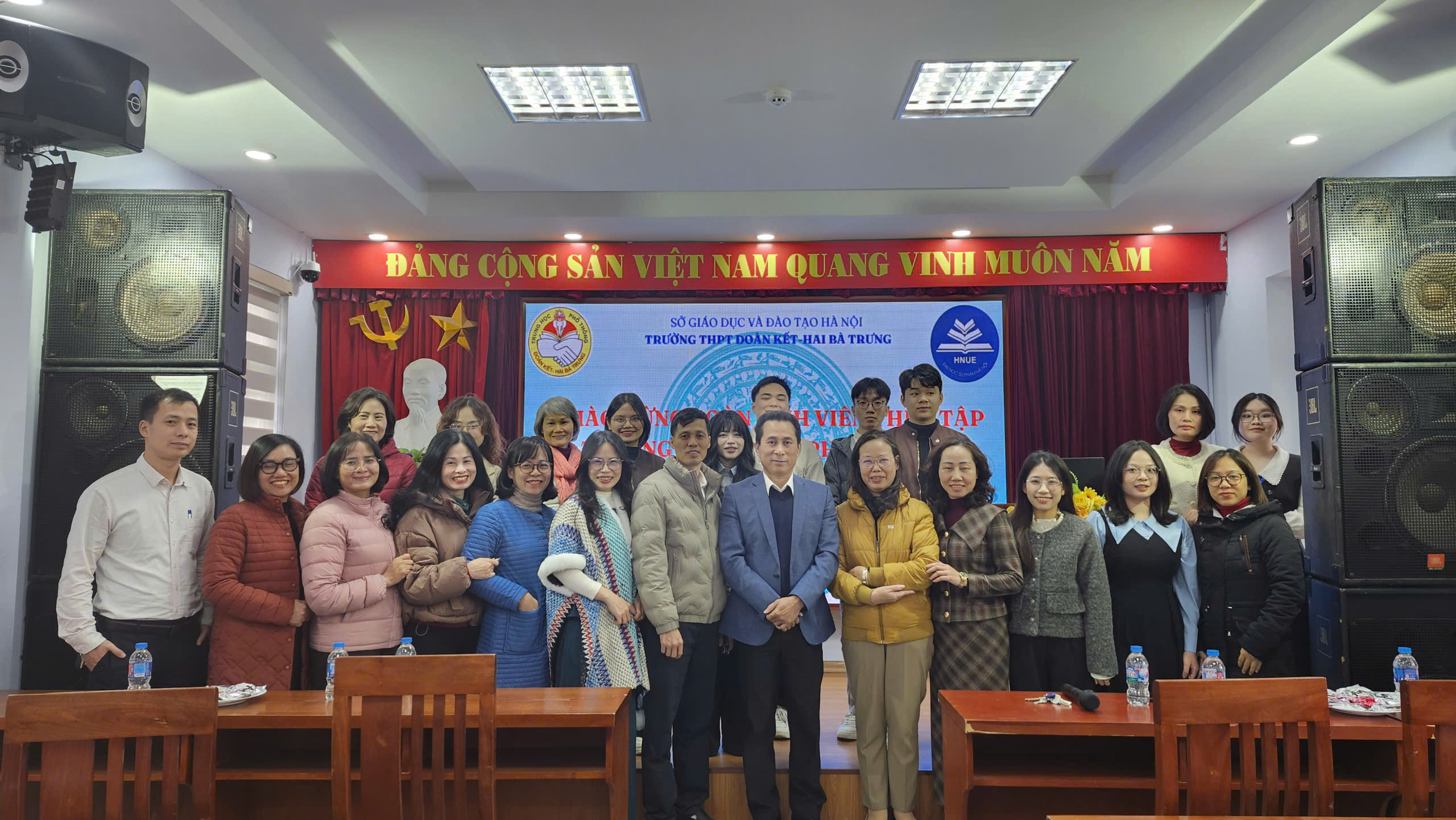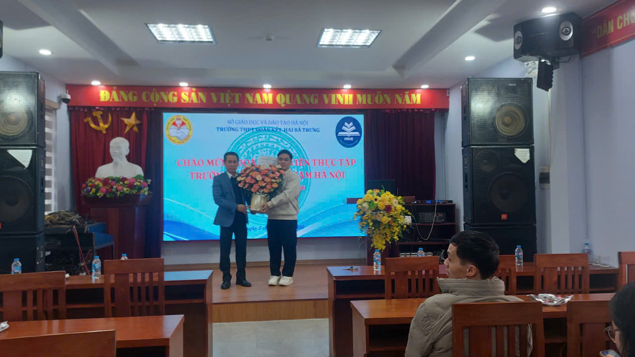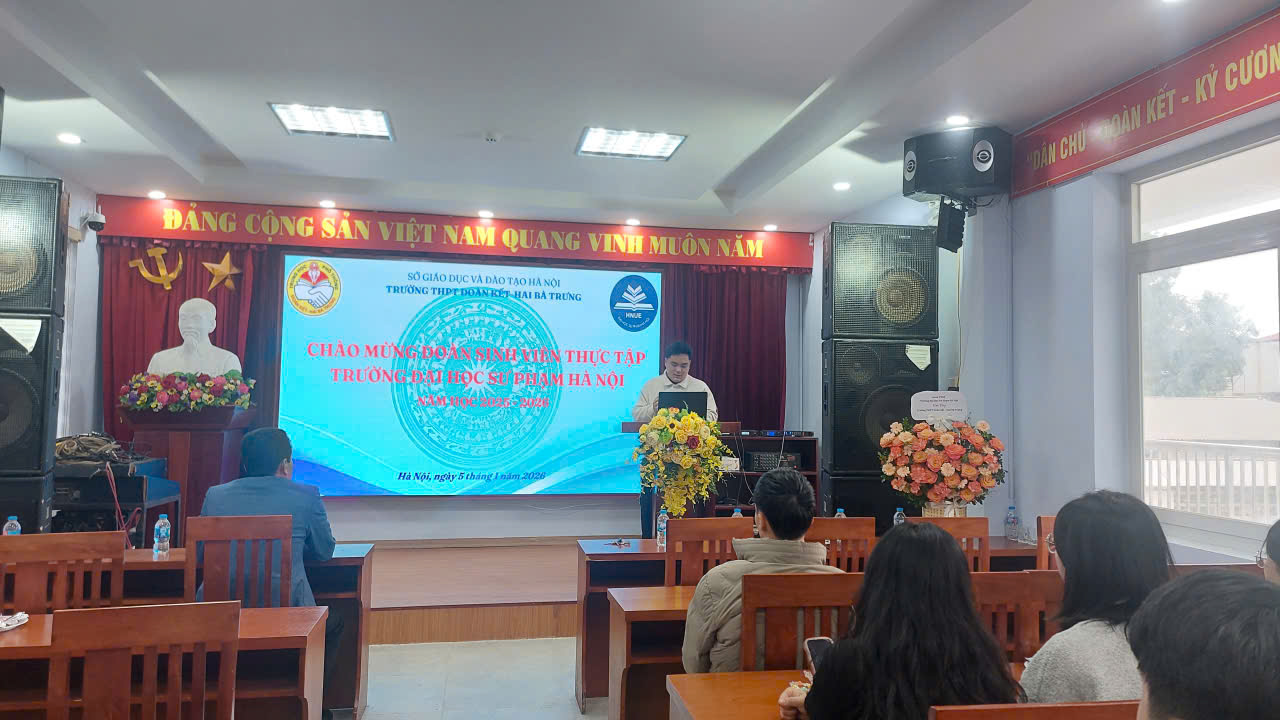 Chiều ngày 05/01/2026, Trường THPT Đoàn Kết – Hai Bà Trưng đã tổ chức buổi gặp mặt, đón tiếp đoàn sinh viên thực tập sư phạm của Trường Đại học Sư phạm Hà Nội đến thực tập giảng dạy và công tác chủ nhiệm tại nhà trường. Đây là hoạt động có ý nghĩa thiết thực, góp phần tăng cường mối liên kết giữa cơ sở đào tạo giáo viên và trường phổ thông, đồng thời tạo điều kiện để sinh viên rèn luyện, hoàn thiện năng lực nghề nghiệp trong môi trường giáo dục thực tiễn.