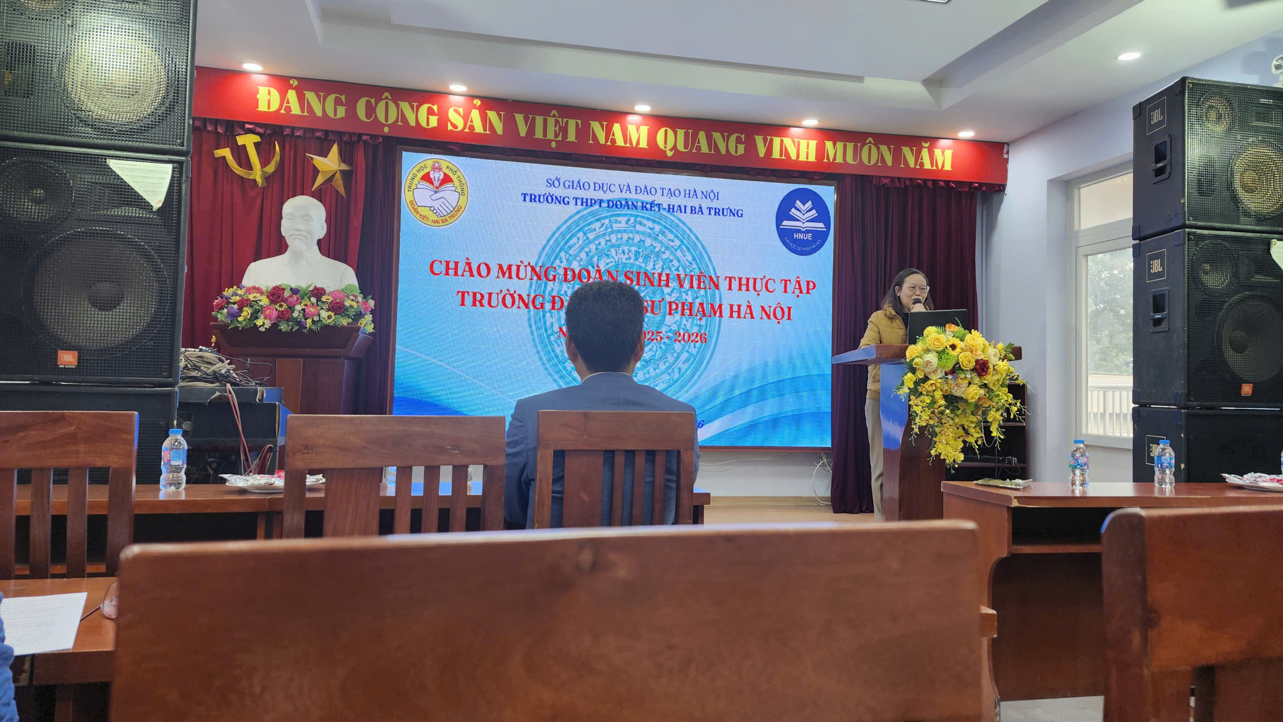 Mở đầu chương trình, cô Phùng Thị Thanh Hà – Phó Hiệu trưởng nhà trường đã giới thiệu khái quát về quá trình hình thành, phát triển, những nét nổi bật trong công tác giáo dục và định hướng chuyên môn của Trường THPT Đoàn Kết – Hai Bà Trưng. Qua đó, sinh viên thực tập có cái nhìn tổng thể về môi trường sư phạm, văn hóa nhà trường cũng như các yêu cầu, chuẩn mực trong hoạt động dạy học và giáo dục học sinh.