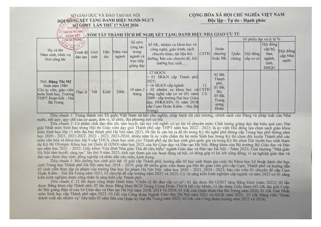 Trường THPT Đoàn Kết – Hai Bà Trưng tổ chức tiếp nhận ý kiến tham gia đóng góp về danh sách cá nhân nhà giáo đề nghị xét tặng danh hiệu “Nhà giáo ưu tú” lần thứ 17 – năm 2026 của quần chúng nhân dân (nhân dân, giáo viên, phụ huynh, học sinh…v.v…) như sau: