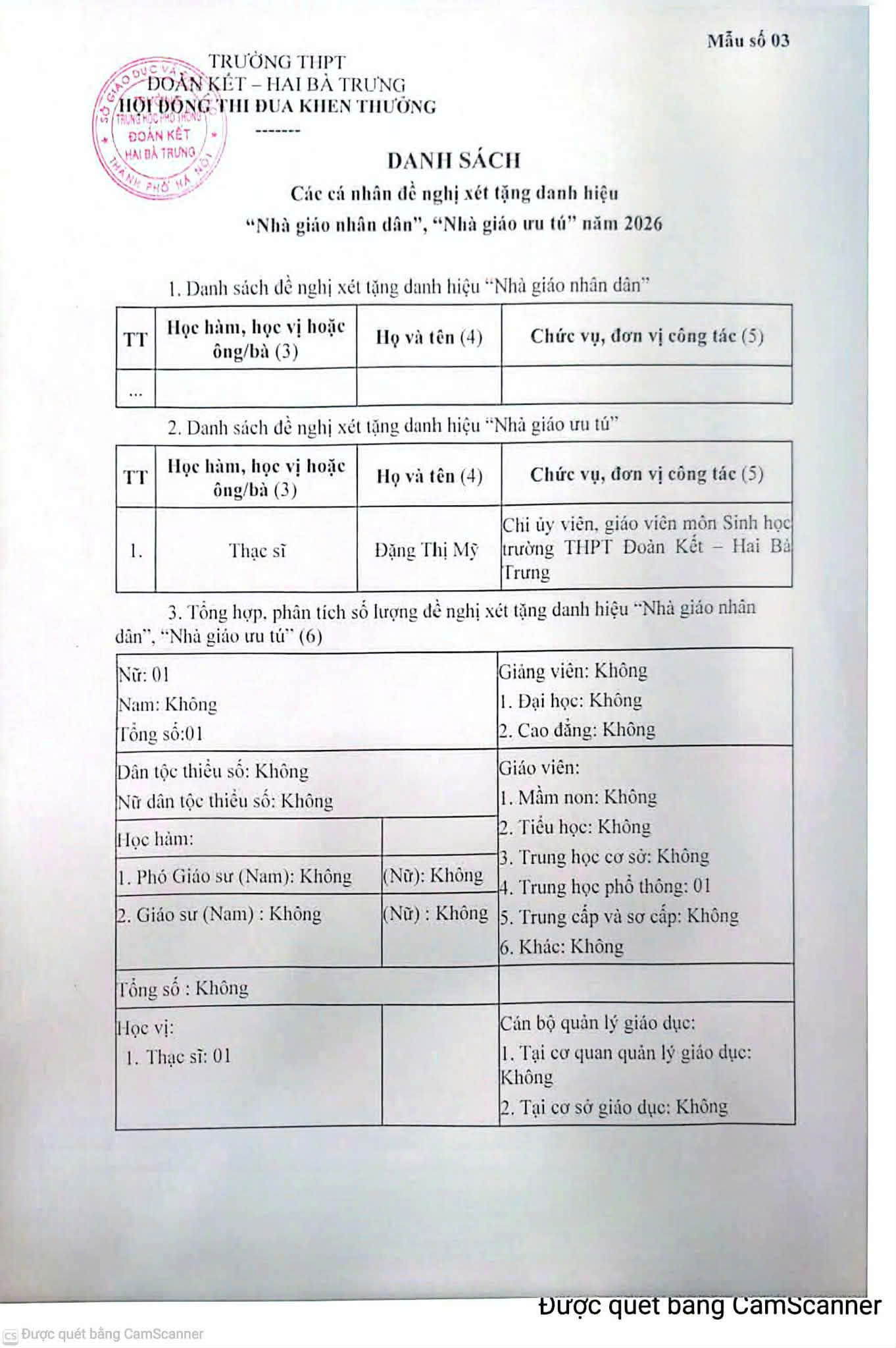 Trường THPT Đoàn Kết – Hai Bà Trưng đã thành lập Hội đồng Thi đua – Khen thưởng, triển khai các văn bản hướng dẫn về việc xét tặng danh hiệu “Nhà giáo nhân dân”, “Nhà giáo ưu tú”. Nhà trường đã tổng hợp, tiếp nhận được 01 cá nhân nhà giáo đề nghị xét tặng danh hiệu “Nhà giáo ưu tú”, cụ thể: