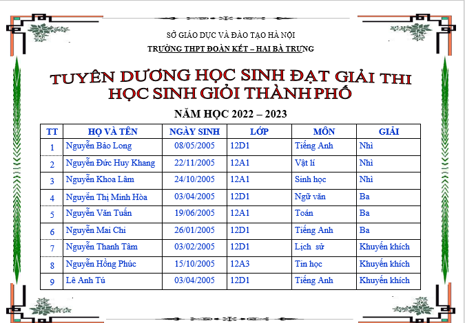 Nhà trường vinh danh các học sinh đạt thành tích cao trong Kỳ thi chọn học sinh giỏi các môn văn hoá lớp 12 trung học phổ thông năm 2022-2023 của trường THPT Đoàn Kết-Hai Bà Trưng sau: