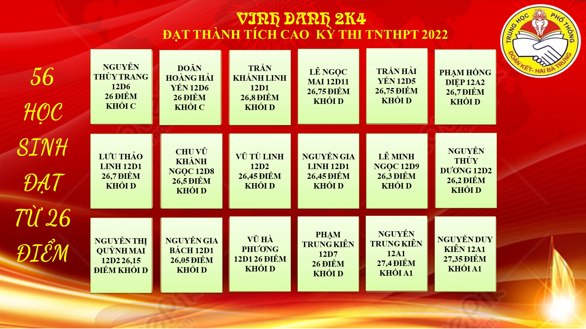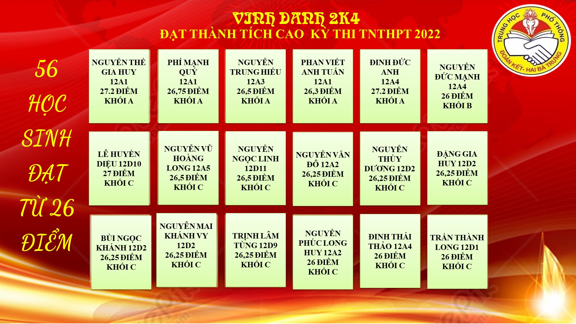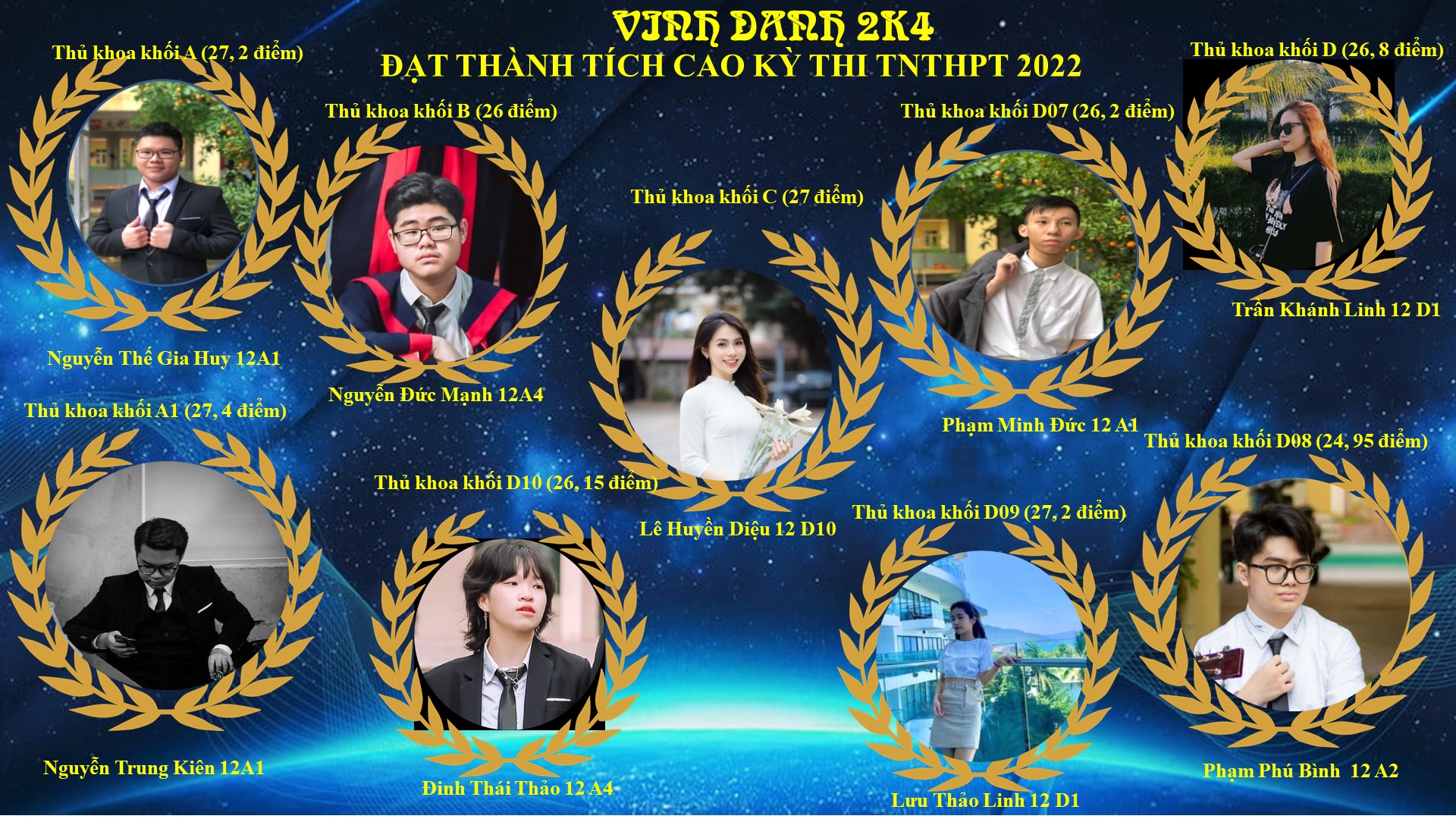 Toàn trường có tổng số 464 lượt học sinh đạt từ 24 điểm trở lên, 56 lượt học sinh đạt từ 26 điểm trở lên ở các khối xét tuyển đại học. Nhà trường tuyên dương các học sinh có thành tích xuất sắc trong kì thi TNTHPT 2022 sau đây. Chúc các em sẽ luôn bay cao, bay xa hơn nữa trong tương lai. Hi vọng trong năm học tới, các em học sinh sẽ vẫn luôn cố gắng phấn đấu trong học tập và rèn luyện để đạt được những thành tích rực rỡ hơn nữa.