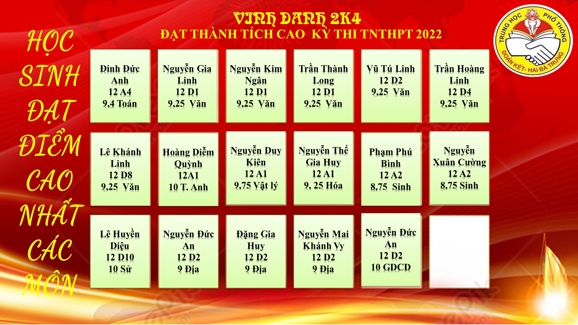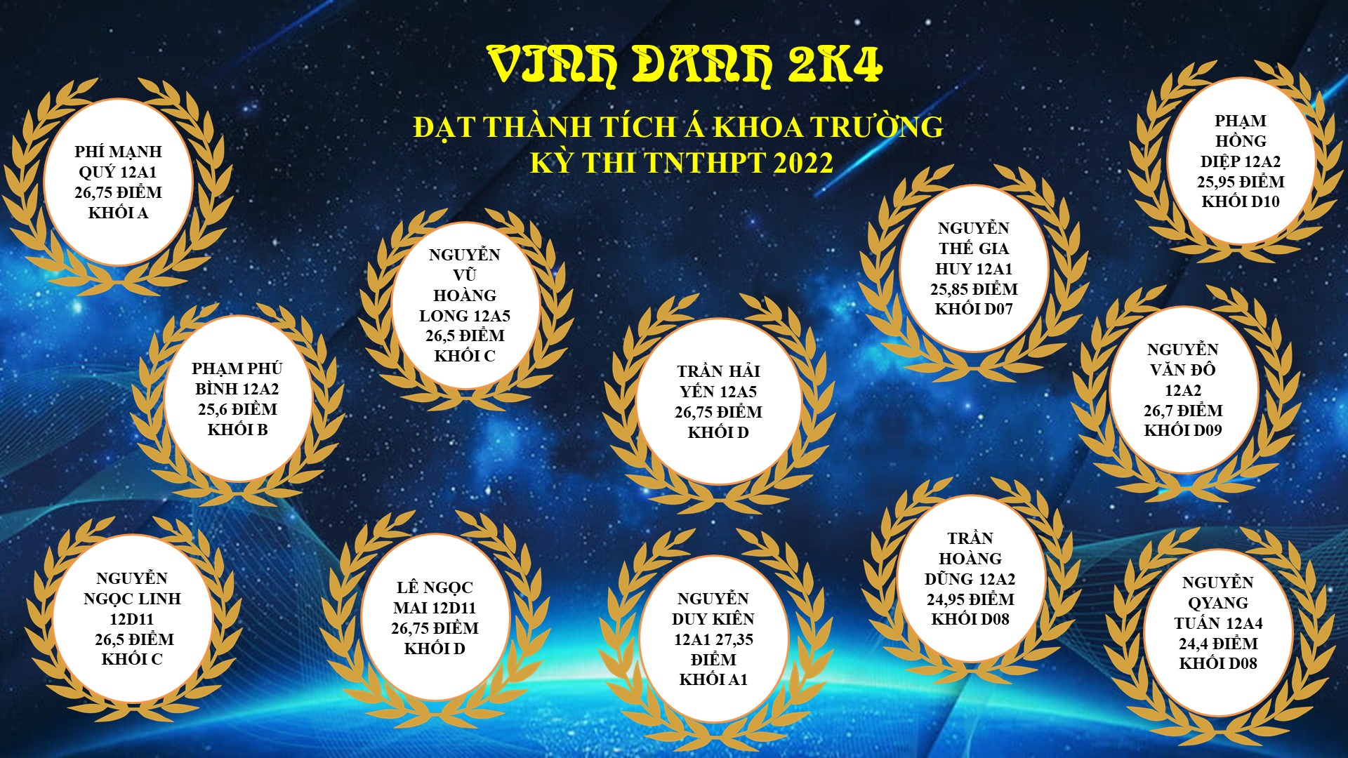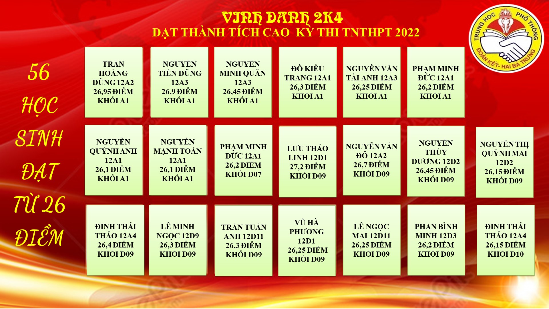 Toàn trường có tổng số 464 lượt học sinh đạt từ 24 điểm trở lên, 56 lượt học sinh đạt từ 26 điểm trở lên ở các khối xét tuyển đại học. Nhà trường tuyên dương các học sinh có thành tích xuất sắc trong kì thi TNTHPT 2022 sau đây. Chúc các em sẽ luôn bay cao, bay xa hơn nữa trong tương lai. Hi vọng trong năm học tới, các em học sinh sẽ vẫn luôn cố gắng phấn đấu trong học tập và rèn luyện để đạt được những thành tích rực rỡ hơn nữa.